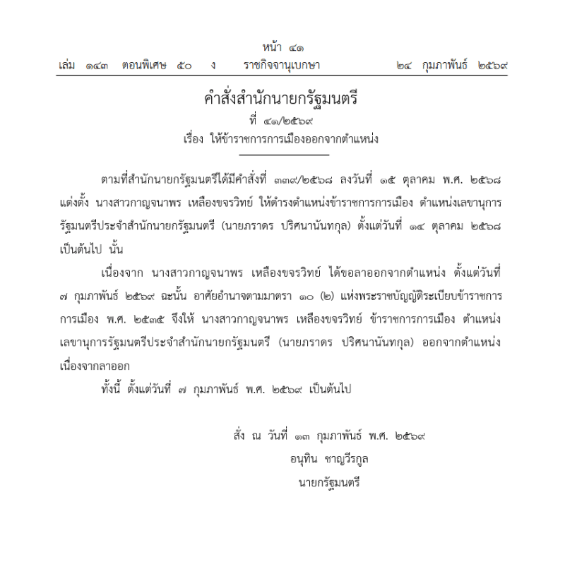 เมื่อวันที่ 25 กุมภาพันธ์ 2569 มีรายงานว่า เว็บไซต์ ราชกิจจานุเบกษา ได้เผยเเพร่ประกาศ คำสั่งสำนักนายกรัฐมนตรี ที่ 41/2569 เรื่อง ให้ข้าราชการการเมืองออกจากตำแหน่ง
